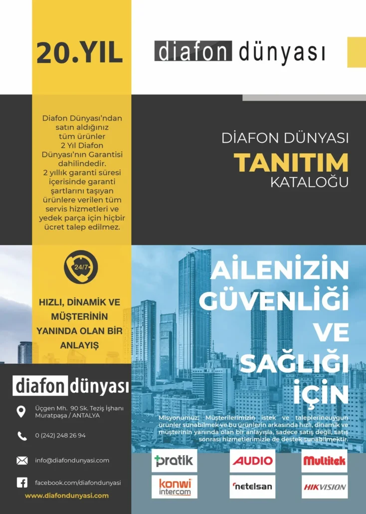 2006 yılında başlayan Diafon Dünyası serüveninin ilk gününden bugününe kadar edindiğimiz misyon; Müşterilerimizin istek ve taleplerineuygun ürünler sunabilmek ve bu ürünlerin arkasında hızlı, dinamik ve müşterinin yanında olan bir anlayışla, sadece satış değil, satış sonrası hizmetlerimizle de destek sunabilmektir.